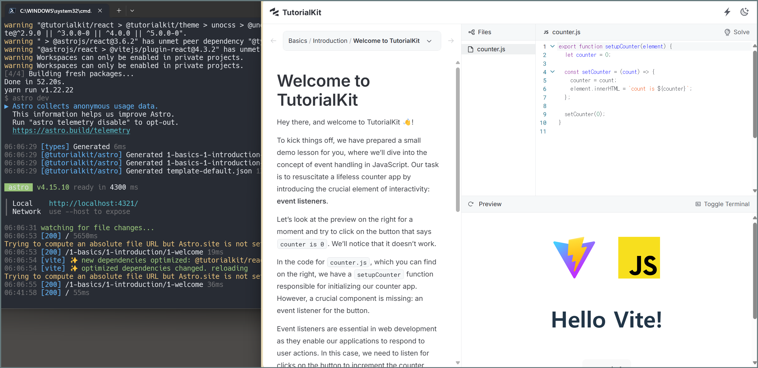 터미널에서 아래처럼 입력만 하더라도 stackblitz.com의 화면과 유사하게 js tutorial을 실행해 볼 수 있다.