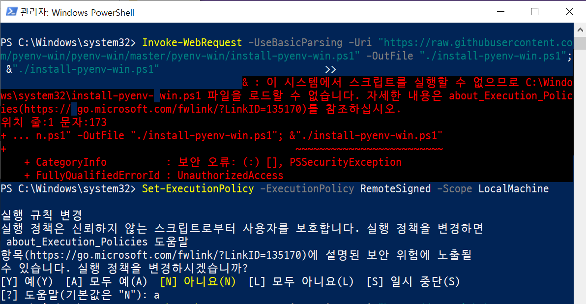 powershell에서 설치시, 아래 문구 입력