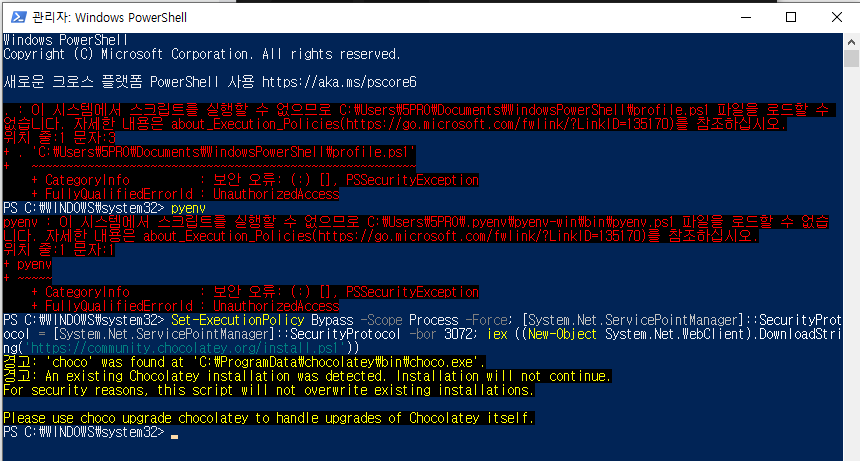 **아래 powershell의 빨간 오류문자를, -ExecutionPolicy Byass 로 우회하여(CMD/powershell 모두) 설치하는 조건임