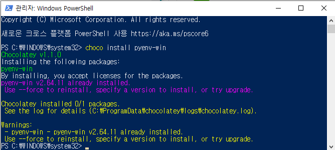 초코플랫폼 설치가 끝났으면 아래 명령어로 pyenv를 설치합니다.