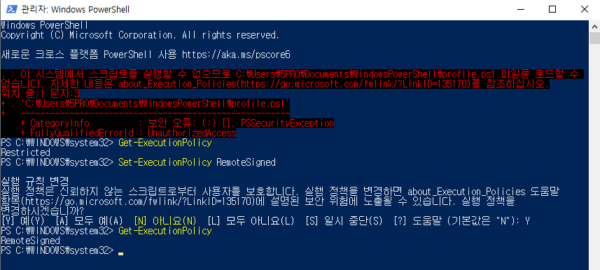 이 시스템에서 스크립트를 실행할 수 없으므로 C:\Users\User\Documents\WindowsPowerShell\profile.ps1 파일을 로드할 수 없습니다. 자세한 내용은 about_Execution_Policies(https://go.microsoft.com/fwlink/?LinkID=135170)를 참조하십시오.